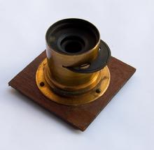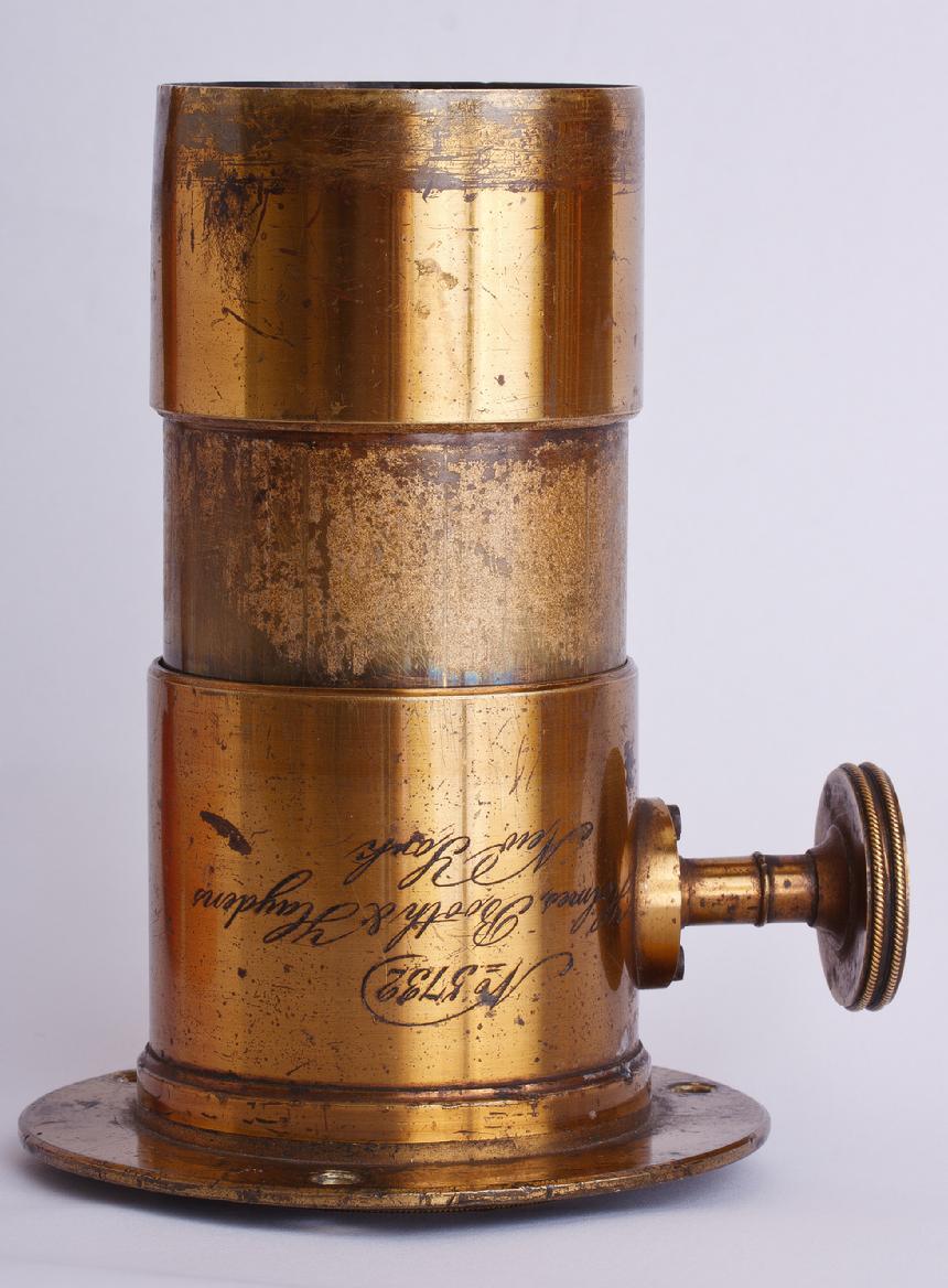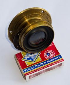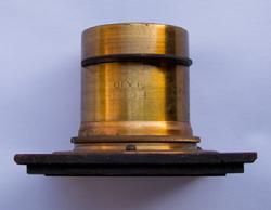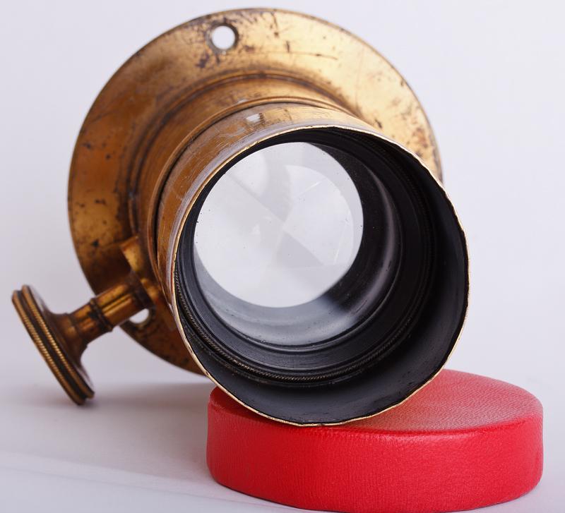 1/4 Plate HBH Petzval lens. Focal length approx. 165mm and an aperture of f/4. Features rarely seen internal cone which is removable, thereby changing the aperture. Serial of 5732 dates it to 1859 or 1860.