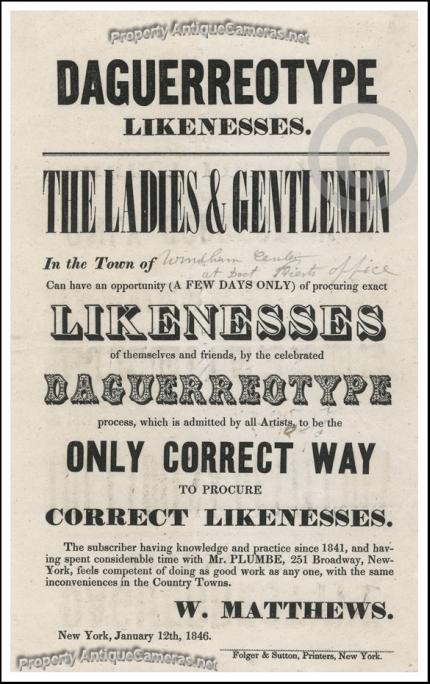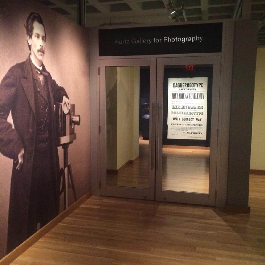 The image below is the entrance to the Kurtz Gallery at the MIT Museum which houses the exhibit. In the background, you'll see a 7 foot enlargement of my 1846 broadside featuring Daguerreotypist, William Matthews, who was taking likenesses in Windham Centre, New York during January 1846 (broadside is dated).