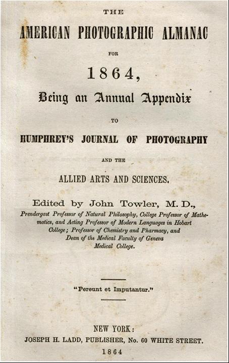 TOWLER, JOHN [editor]. The American Photographic Almanac for 1864, Being an Annual Appendix to Humphrey's Journal of Photography, New York: Joseph H. Ladd, 1864. 12mo, pp. 144, 18 (ads), original red cloth boards with gilt stamped lettering on upper panel inside blind-stamped decorative border.