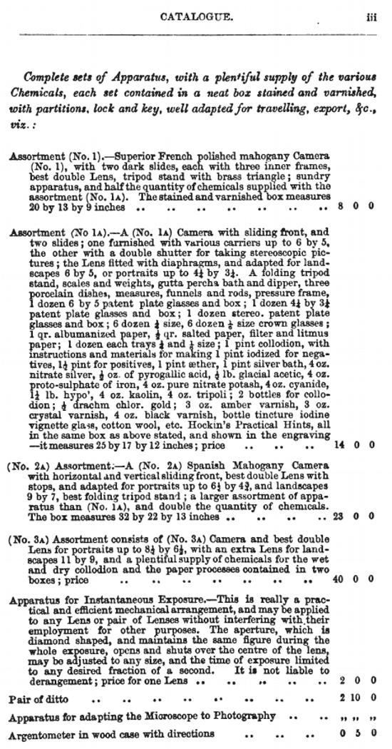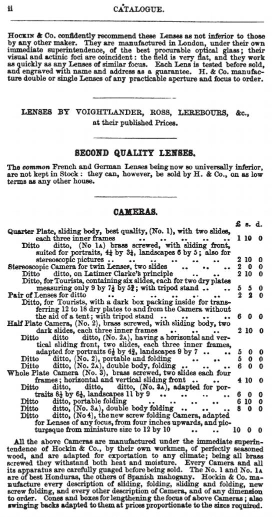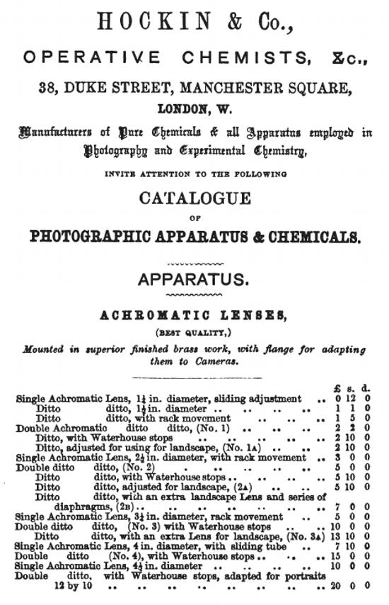 London based, photographic materials dealer, Hockin & Co., published the book, Practical hints on photography: its chemistry and manipulations, in 1860. Included in the book is Hockin's catalogue of photographic equipment.