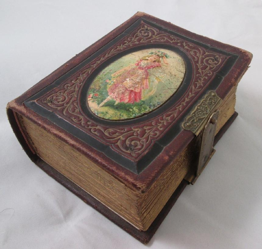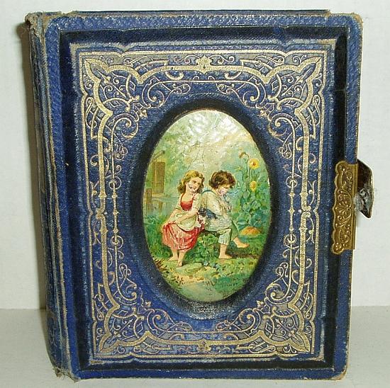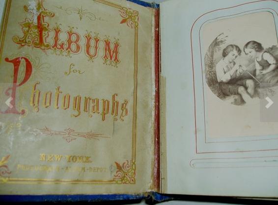 The second item is an instruction card that was placed inside a Cartes de Visite album. This probably dates to the late 1860s. Veteran image collectors tell me these "trim cards" are still sometimes found inside old CDV albums produced in the 1860s and 70s. Interstingly, there is very little information on the web for the "New York Photograph Album Depot." However, I found examples of their albums on Etsy and Ebay (below).