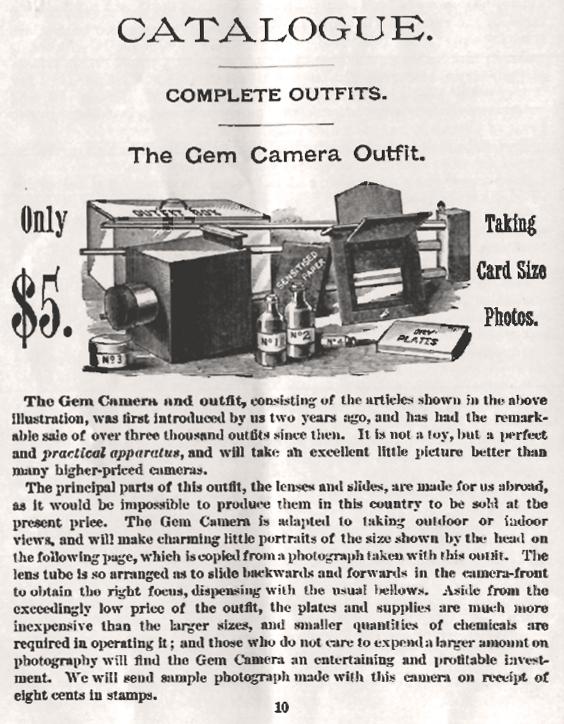 One of the catalogued items was the Gem Camera as shown below. Note the mention that over 3,000 outfits had already been sold in the previous 2 years.