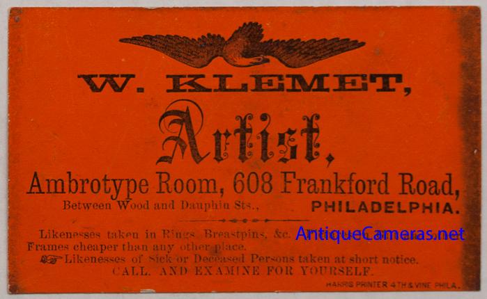 Business card from W. Klemet in orange. John Craig's Daguerreian Registry has the following entry: "Ambrotypist, 608 Frankford Road, Philadelphia, Pa., 1860-1861"