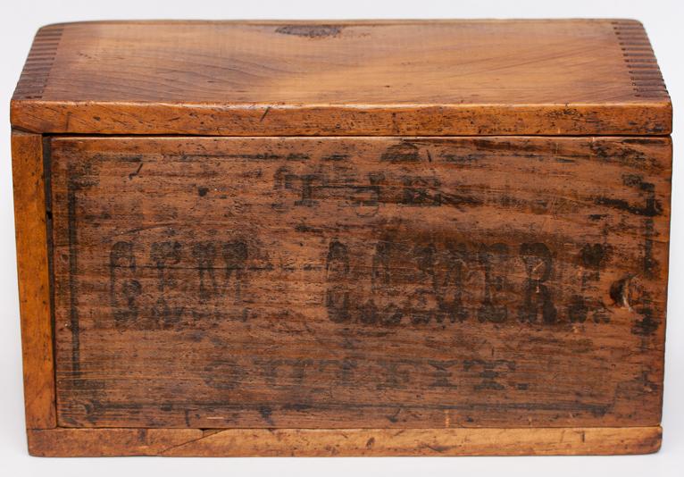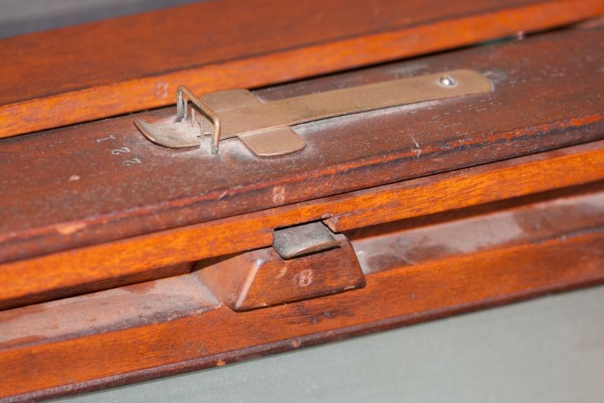 Curiously, the catalogue states and the illustrations show, the wooden carrying-case has a handle, yet my example doesn't show any evidence of a handle ever attached.