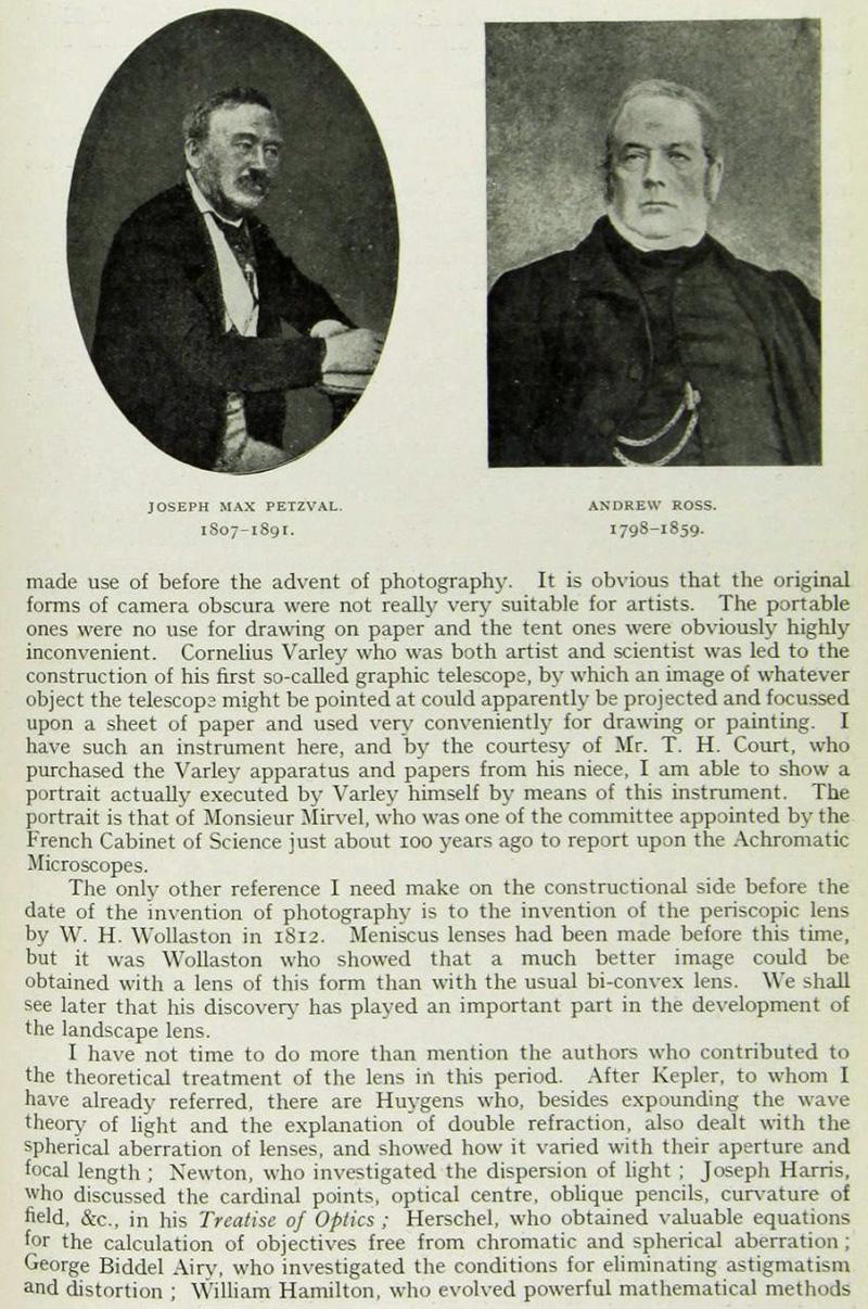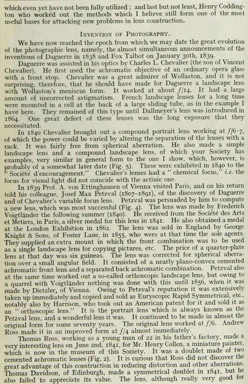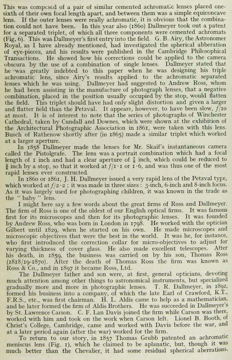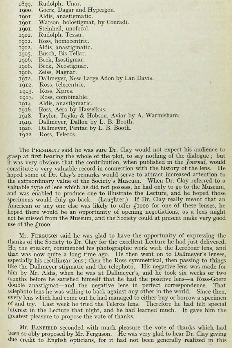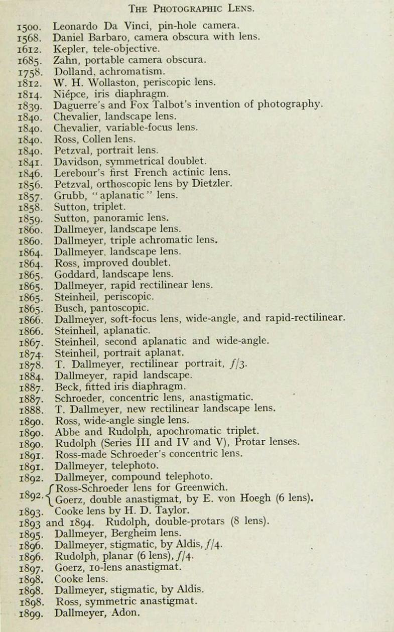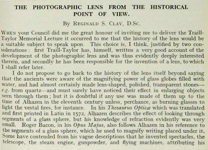 Various histories of the photographic lens have been written over the last 150+ years and each has its own "version" frequently based on the author's country of origin. Presented below is a history of the lens written by Reginald S. Clay in The Photographic Journal of the Royal Photographic Society, November 1922 issue.