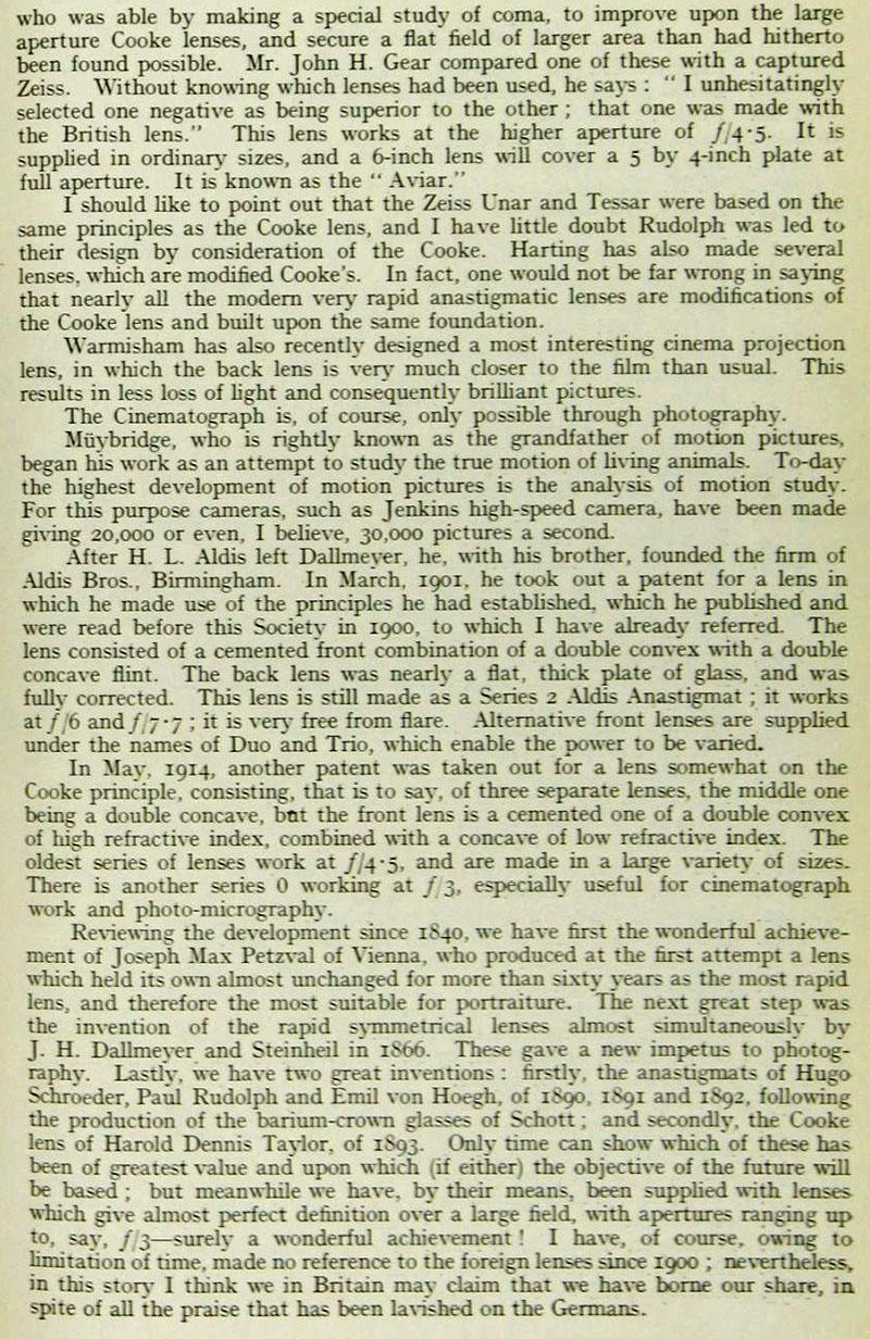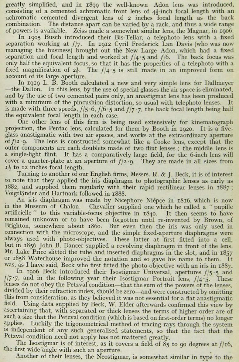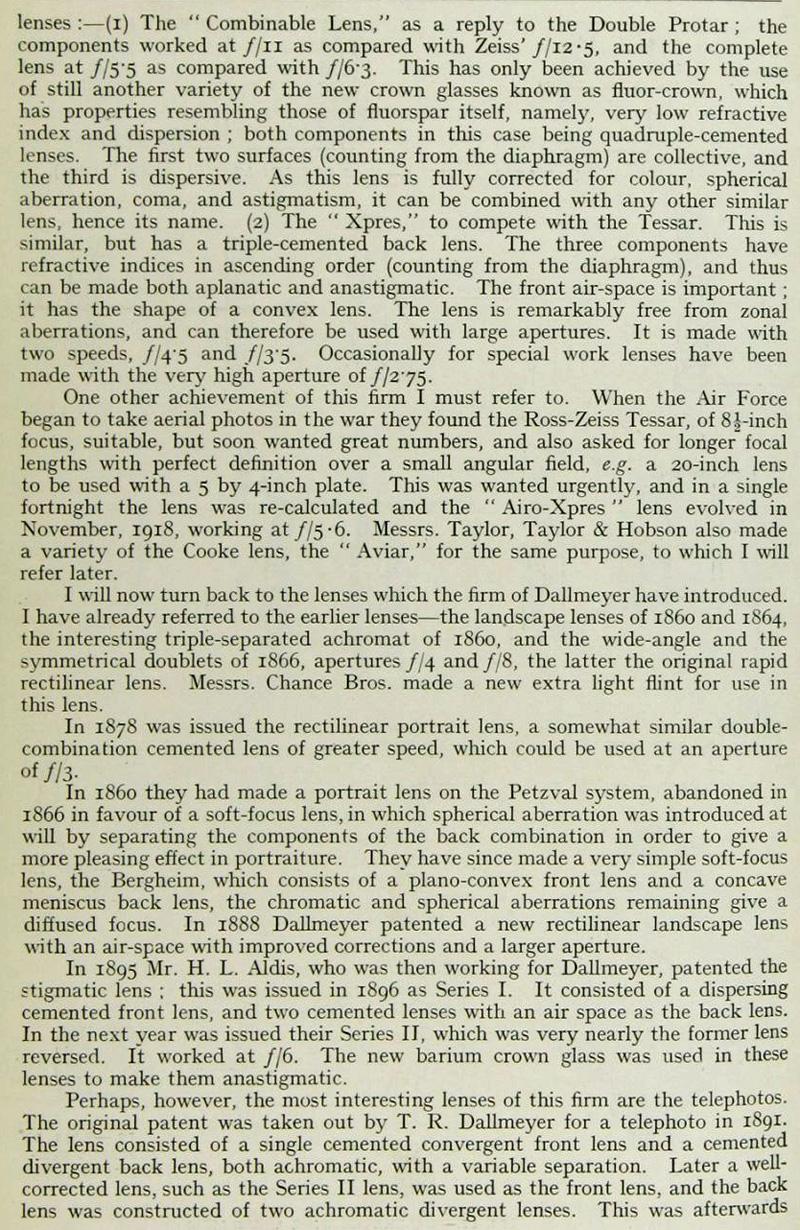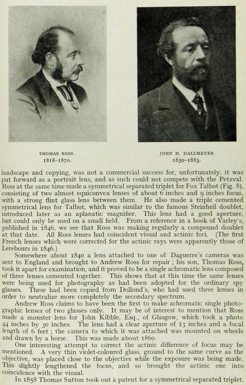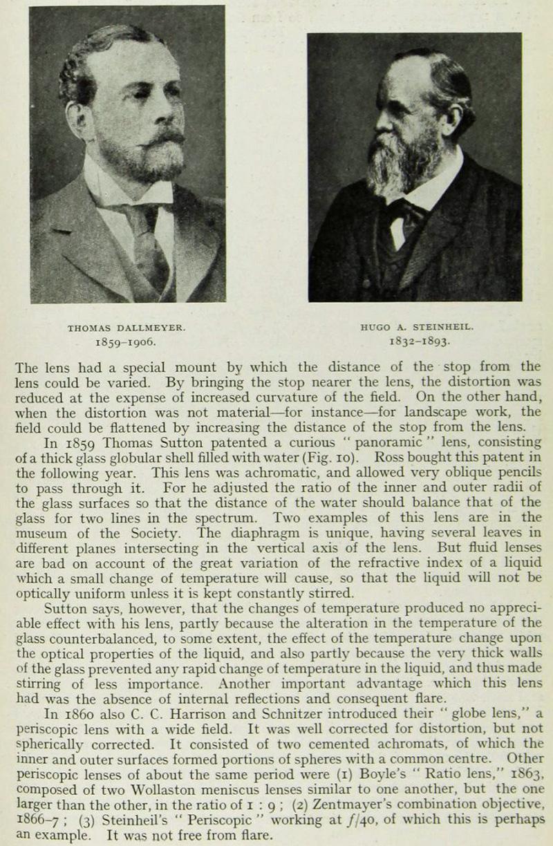 Various histories of the photographic lens have been written over the last 150+ years and each has its own "version" frequently based on the author's country of origin. Presented below is a history of the lens written by Reginald S. Clay in The Photographic Journal of the Royal Photographic Society, November 1922 issue.