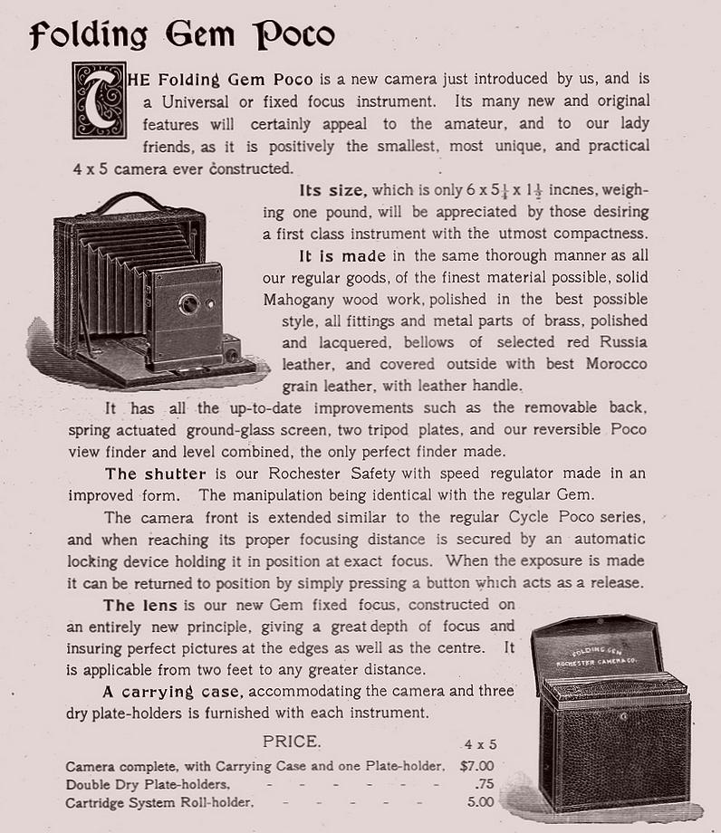 In 1898, The Rochester Camera Company brought the Folding Gem Poco to market. Among the countless other folding plate cameras being sold at the time, this example was a fixed focus model which the maker claimed, "is the positively the smallest, most unique, and practical 4x5 camera ever constructed."
