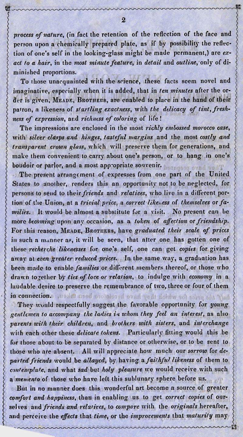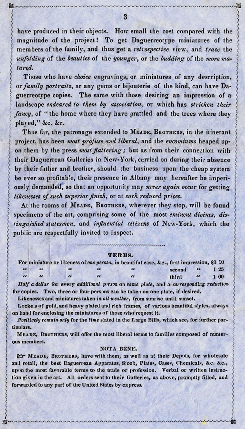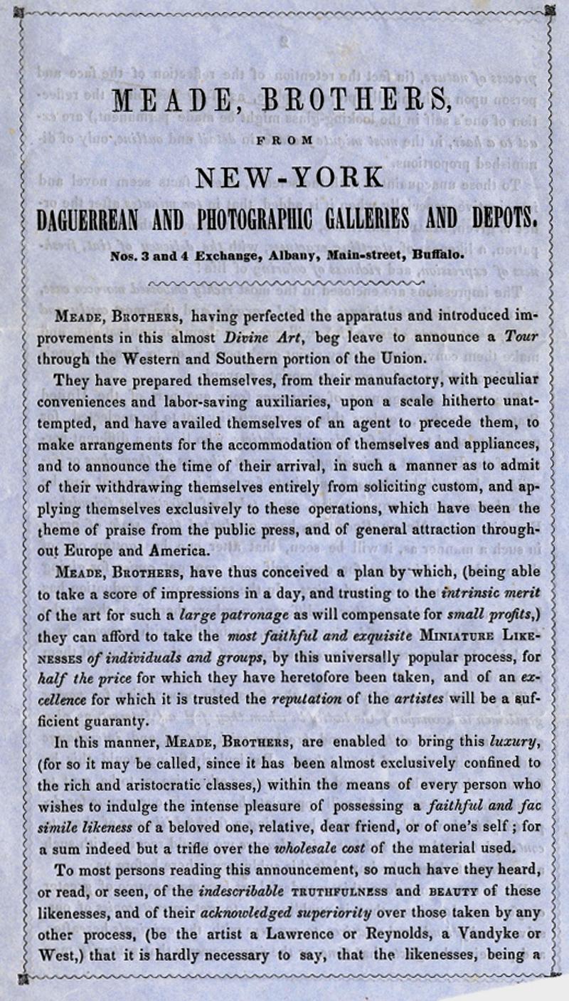Locating broadsides from the Daguerreian era is particularly fascinating given you can learn so much about how the business operated as well as what the "artists" themselves thought was important to emphasize to its customers. Having a multi-paged advertising piece is even more impressive and enlightening. The New York Public Library possesses just such a piece from the well known Meade Brothers.