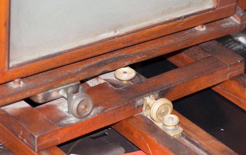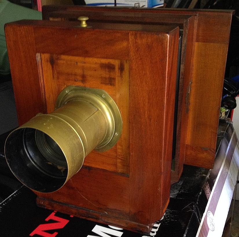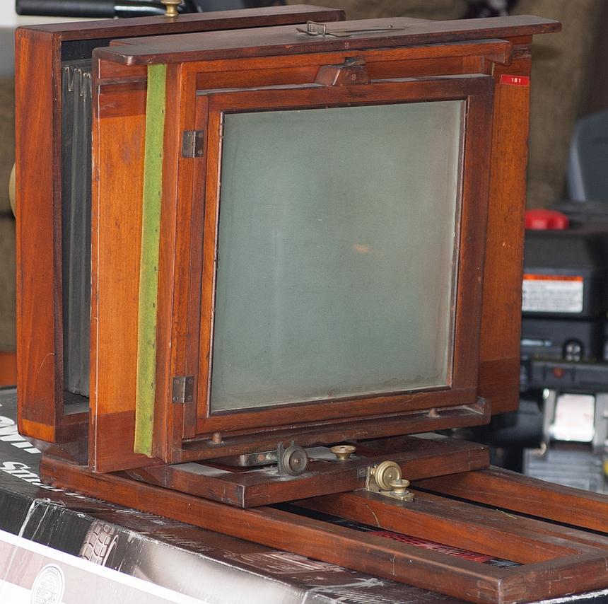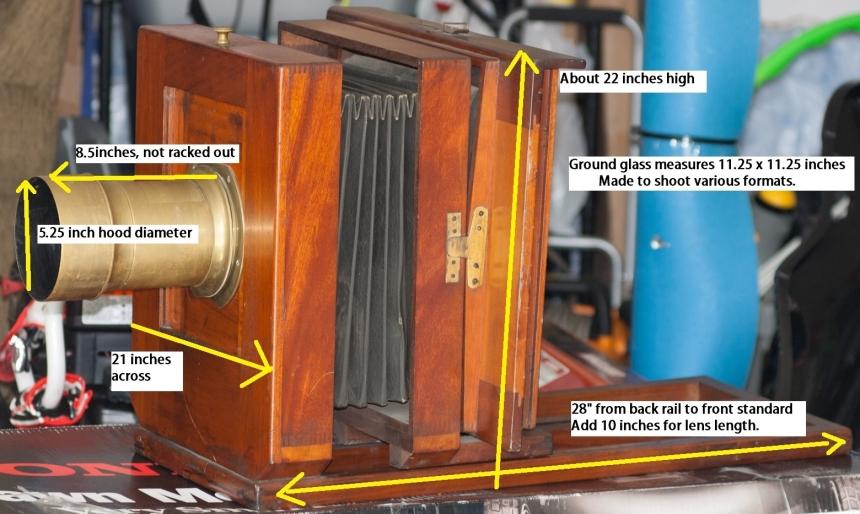 The bed is non-folding which makes for a rather large camera that weighs in at 28 pounds and is three feet long from lens hood to rear bed rail. The mahogany wood is quite stunning on the camera and it has a wonderful patina to it.