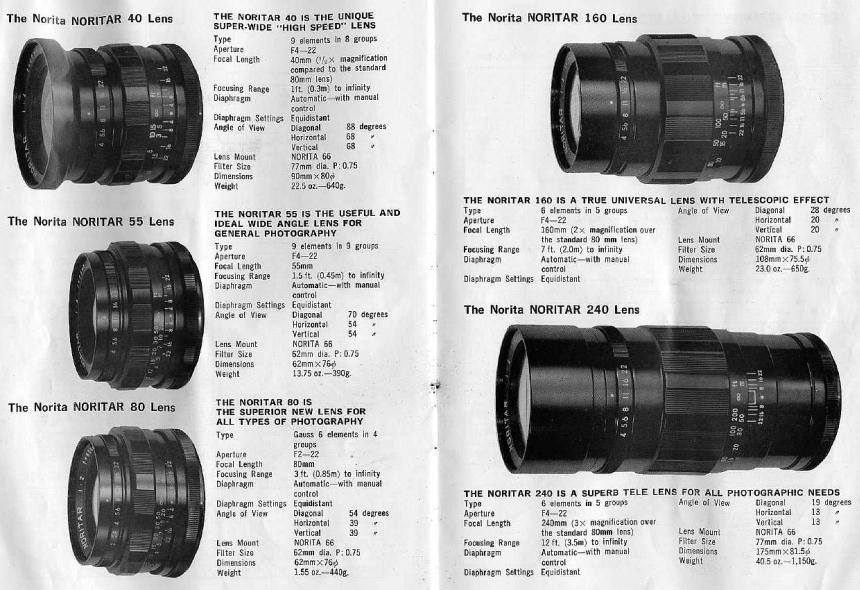 Norita would also produce a 70mm f/3.5 leaf shutter lens and a 400mm f/4.5 telephoto in addition to the standard lens range shown above.