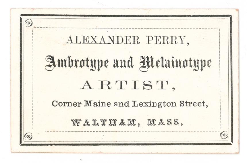 I recently acquired two new pieces to add to my collection. The first dates to very late 1850s/early 60s. It is a business card from Alexander Perry, an "Ambrotype and Melainotype Artist" from Waltham, Massachusetts. John Craig's Daguerreian Registry remarks about Perry: