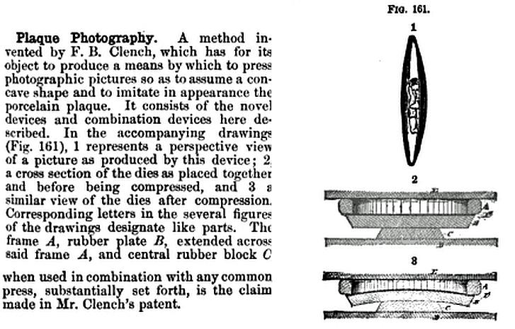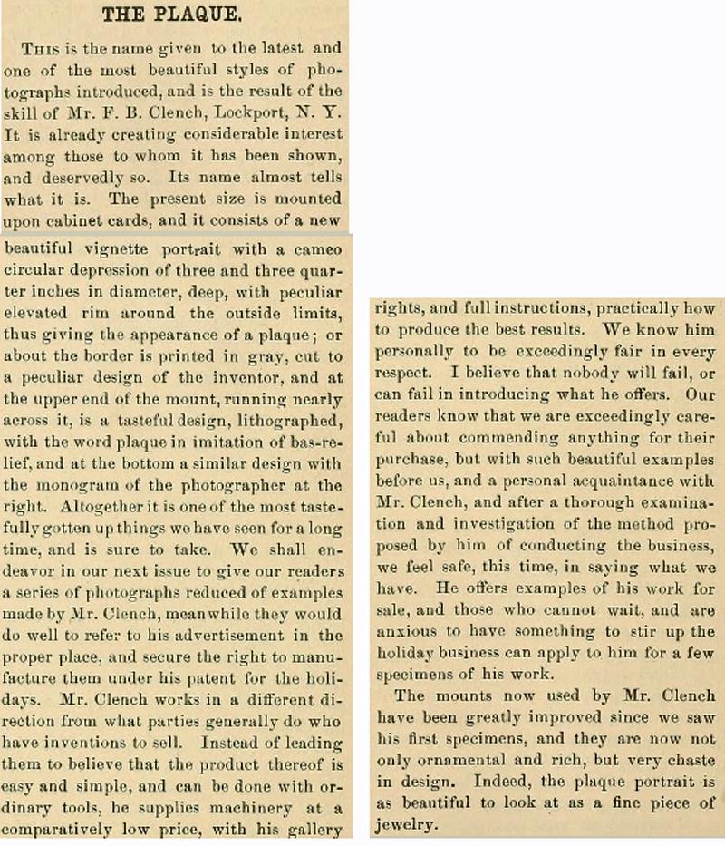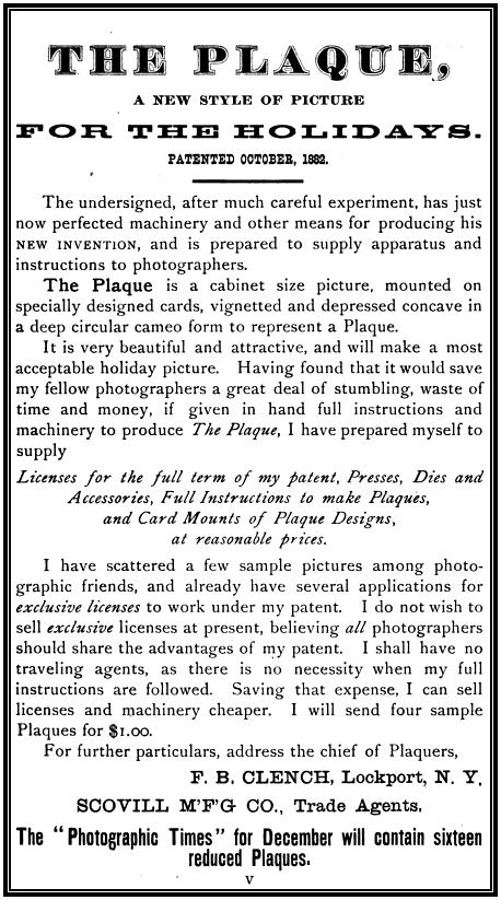 Clench would also patent and license a new type of photograph called, the Plaque. Advertising described it as, "a cabinet size picture, mounted on specially designed cards, vignetted and depressed concave in a deep circular cameo form to represent a plaque."