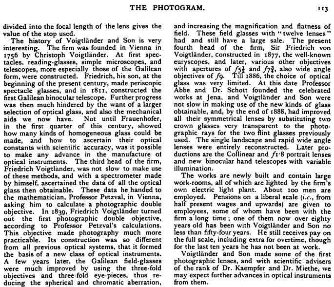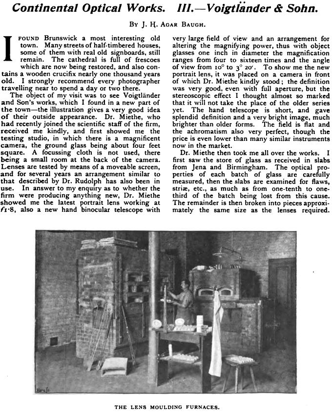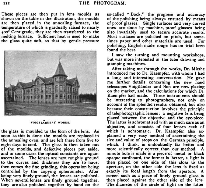 An article featuring Voigtlander's Brunswick (Braunschweig) lens factory. Published in The Photogram, Vol. 3, London 1896.