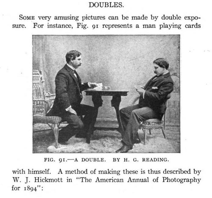 How were these images created? Well, the standard reference on "trick" photography is the book, Photographic Amusements by Walter E. Woodbury. First published in 1896, the 9th edition is available online to read, thanks to google. Page 106 describes "doubles" and other multiple exposure methods.