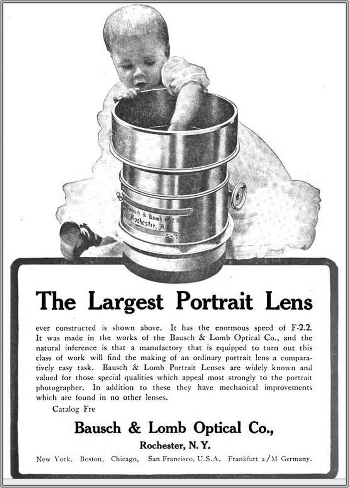 In 1904 however, Bausch & Lomb came out with a very fast and large Petzval, known as their Portrait Lens B, with an aperture of F/2.2. While "only" featuring lens diameters ranging from 4 to 7 inches, the enormous aperture makes this a big lens. The lens was featured in the 1904 lens catalogue from Bausch & Lomb and appears to have been on the market for only a few years. Production was likely very small given the costs and logistics of using such a large lens.