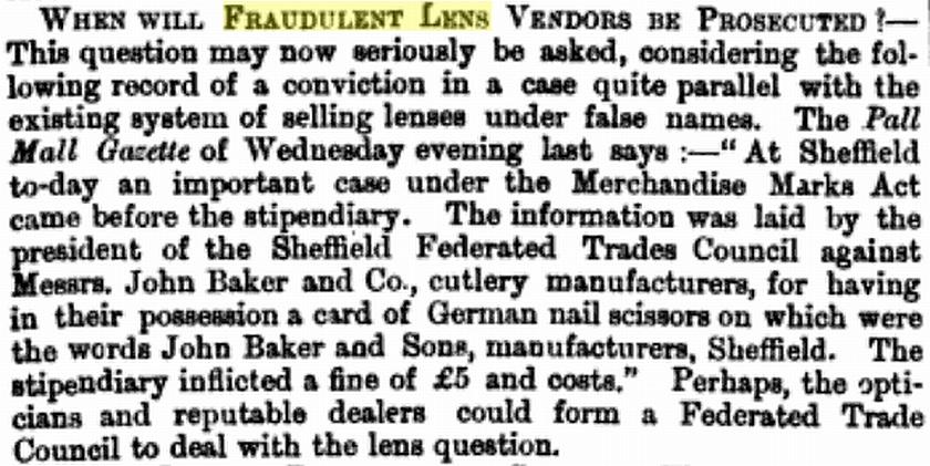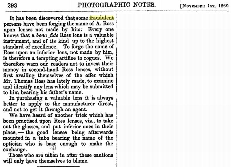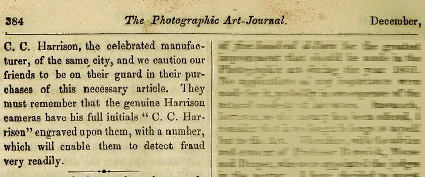 December 1852 article mentioning guarding against fraudulent CC Harrison lenses.
