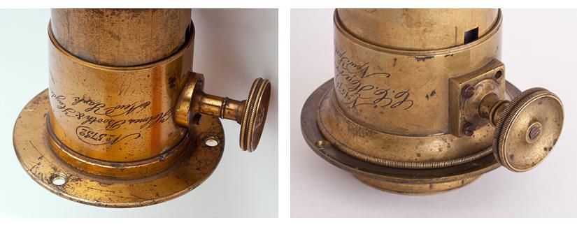 On the left, is the well known, round radial drive housing as found on a c. 1858 Holmes, Booth & Haydens portrait lens. On the right, is the square housing found on US made lenses of the 1851-1854 period. This date has been based triangulated based on extant lenses, contemporary literature and known serial number records. It appears that in 1850 or 1851, the radial drive replaced the tangential drive on US made lenses. The first radial drives featured this square housing, and by about 1854, a round housing replaced it and became the standard design for the next twenty years or so. This date is also supported by noting that Holmes, Booth & Haydens entered the lens market in early 1854 and their lens, serial # 80, features the squared drive (see http://hbh.gordonmoat.com/ ), but just a few hundred lenses later, their lenses are found with round housings.