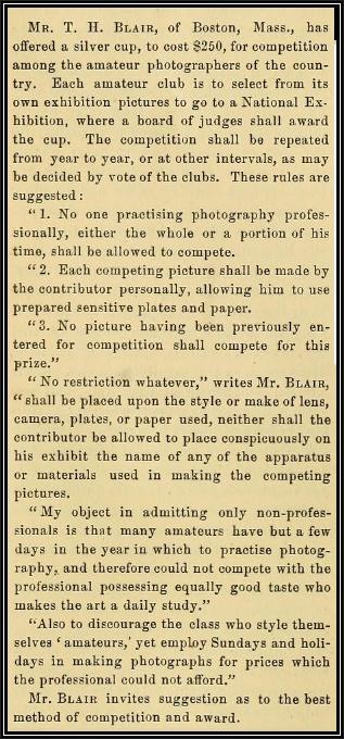 In 1886, and again in 1887, Blair sponsored a photographic competition via The Photographers Association of America offering a solid, silver cup as the grand prize. The cup, made by Tiffany, was a $ 250 value, and the competition was referred to as the Blair Cup. The winner of the contest, both in 1886 and 1887, was James Landy. While the original intent was for this to be an amateur competition (see first article below), Blair later decided to have The Photographers Association of America establish the rules of the contest (see second article). The back to back winner in '86 & '87, was James Landy, a professional photographer from Cincinnati, Ohio.