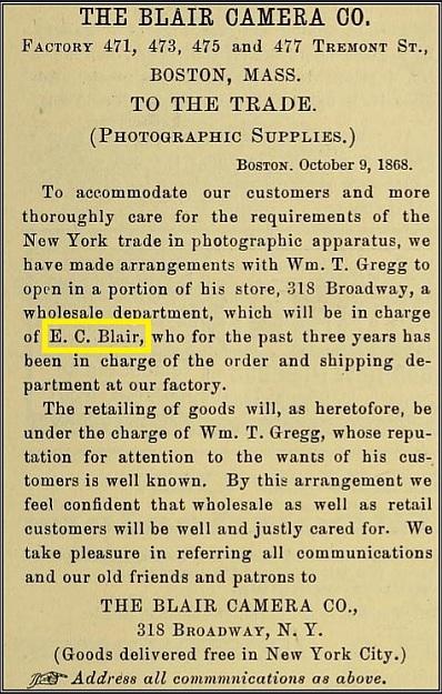 Thomas' brother, Edwin Clay Blair (1862-1945), left Nova Scotia and came to the US in 1881. Edwin was not only a photographer, but also worked within the Blair Camera company as the head of the Order and Shipping department. See the article from Oct. 9, 1886 in The Philadelphia Photographer magazine below.