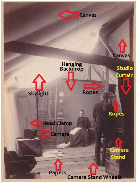 At first glance, this "just" appears to be a studio scene of a woman having her portrait taken, c. 1890. As you scan the image, one starts to notice the additional camera in the image, the head clamp, the system of ropes to alter the light coming in the studio, the painted backdrop, the rolling camera stand, and most importantly, you realize this studio is actually a tent ! The ceilings and walls are actually canvas.