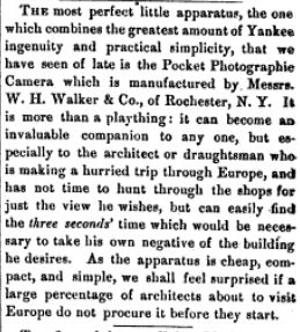 For a year his attention was directed wholly to these photographic studies, which were supplemented by experiments with practically all the then known processes and apparatus. The result of these investigations was the development on a commercial scale of a small camera for amateurs known as Walker’s Pocket Camera. This camera attained a marked success and was purchased particularly by engineers for facilitating preliminary surveys of projected railways and other works. It was the first camera specially adapted to the needs and capabilities of amateurs.