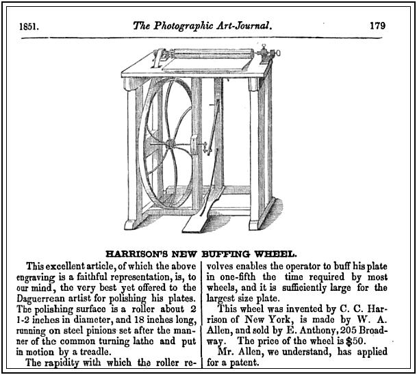 Harrison also designed a Daguerreotype Buffing Wheel in 1851. The illustration is from the March 1851 issue of The Photographic Art Journal.
