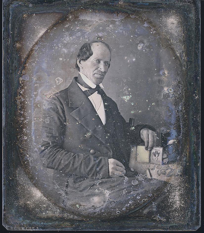 In front of the camera, two small books were purposely placed behind the held Daguerreotype to support it during exposure. This points to the image being planned and thoughtfully executed.