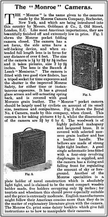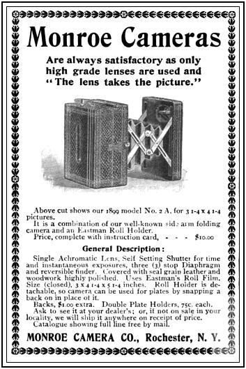 Marti's auction is for a Monroe Pocket Camera. Silas French designed the camera type and was awarded a patent for the design on May 18, 1897. The camera was made and sold sold by the Monroe Camera Company of Rochester beginning in 1897. The higly compact camera, which was sold in a few sizes over time, is constructed of mahogany with brass struts and red leather bellows. This particular camera, the No. 2 model, took 3.5" x 3.5" inch sized images on dry plates or cut film. The camera measures just 4.25" x 4.25" x 1.5" when closed. This sized camera was known as the "Folding Camera," "Folding Pocket Camera" as well as the "No. 2 Folding Pocket Camera" in various advertising for the item. Made for about 2 years, these are pretty uncommon and with most of its original box - that just adds to the collectibility of this particular item.
