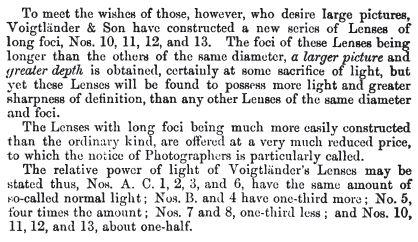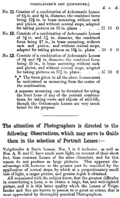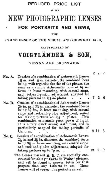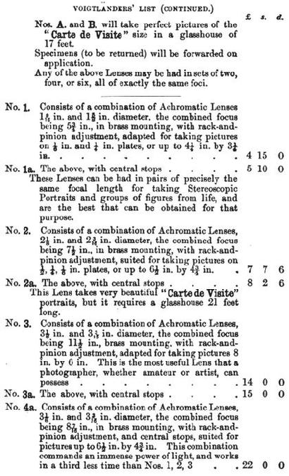 Voigtlander is the first name in Antique portrait lenses. From the very beginnings of photography, Voigtlander was a company synonymous with high quality. While much is known about their Petzval lenses, catalog listings showing the various sizes/model numbers are not too common. Below is an 1864 catalog listing that should help identify each model. In 1864, the serial numbers for these lenses was at about 12,000.
