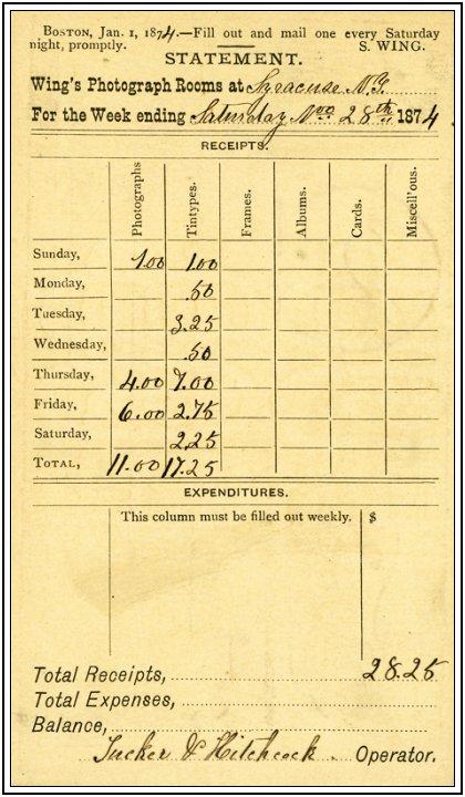 Below is a weekly report mailed to Simon Wing in November 1874 from an "Operator" of one of "Wing's Photograph Rooms" located in Syracuse, New York. The post card details the amount of business done during that time period. A unique piece of Simon Wing photographica.