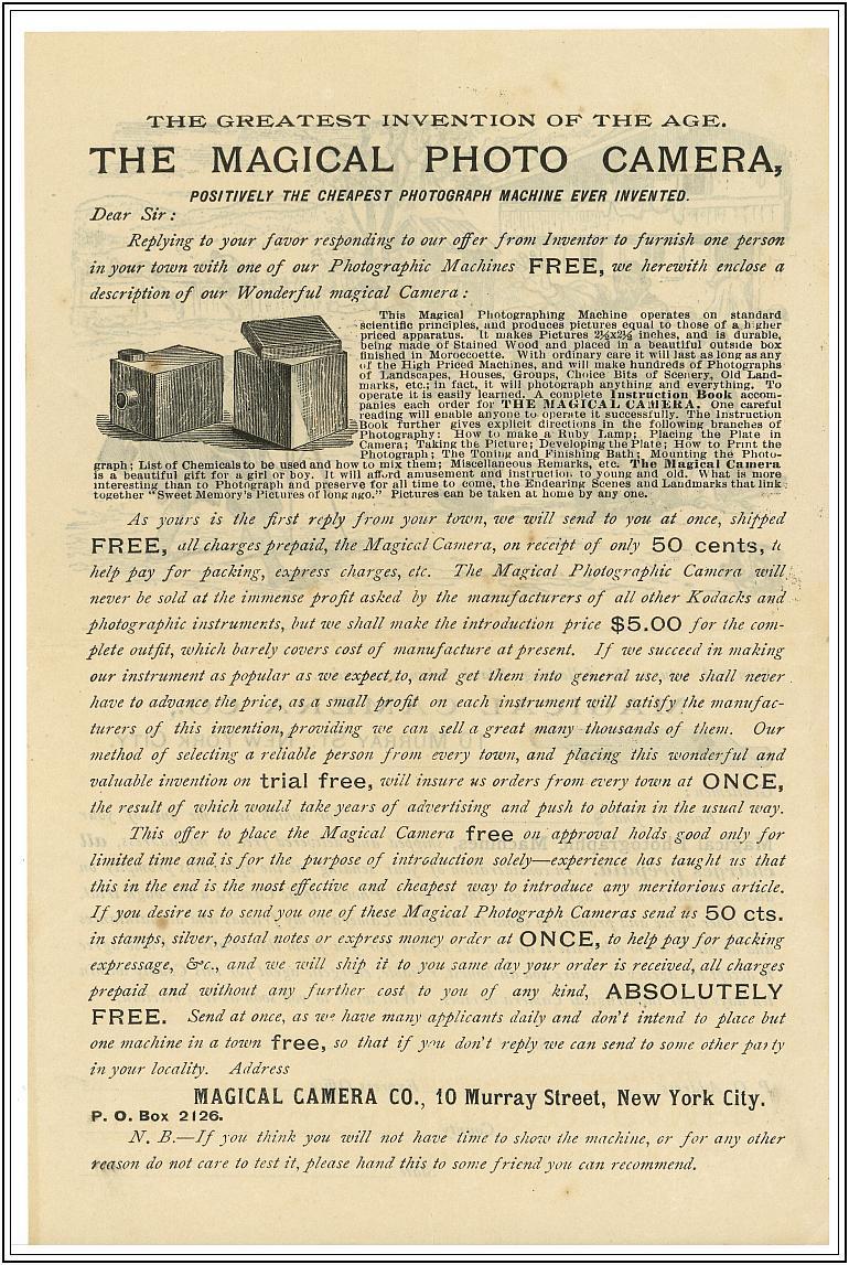 The # 2 model, which was 1/4 plate in format (3 1/4" x 4 1/4"), was sold as part of kit for students and children. It was first sold in 1887 and ran until about 1900. It was sold directly from Horsman, via Sears, Roebuck & Co., as well as given as premium giveaways (sales incentives) by many firms.