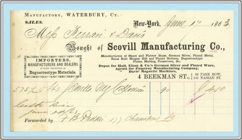 Billhead from Scovill Manufacturing from 1863.... That's right in the middle of the Civil War. Reading handwriting from this period can be difficult, but it looks as if 5 pounds of Scovill NY Collodion was purchased at a rate of 90 cents per pound. Also, note the reference to Costa Rica (June 24, 1863). The buyer was the photographic firm of Ferrari and Davis. Leopoldo de Ferrari and Daniel H.B. Davis were listed in Trow's new York City Directory of businesses in 1864 and I have also seen references that show they were still in business in the early 1870's.