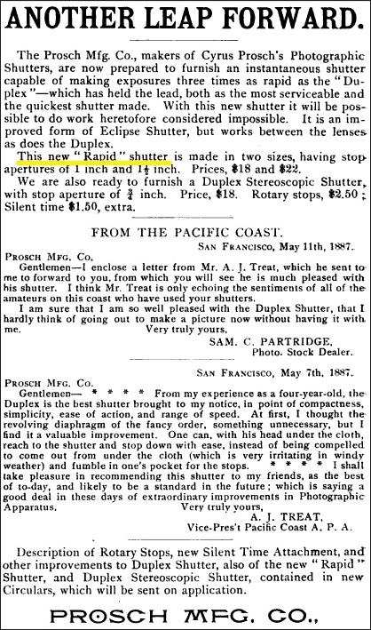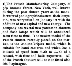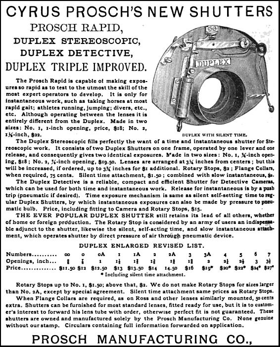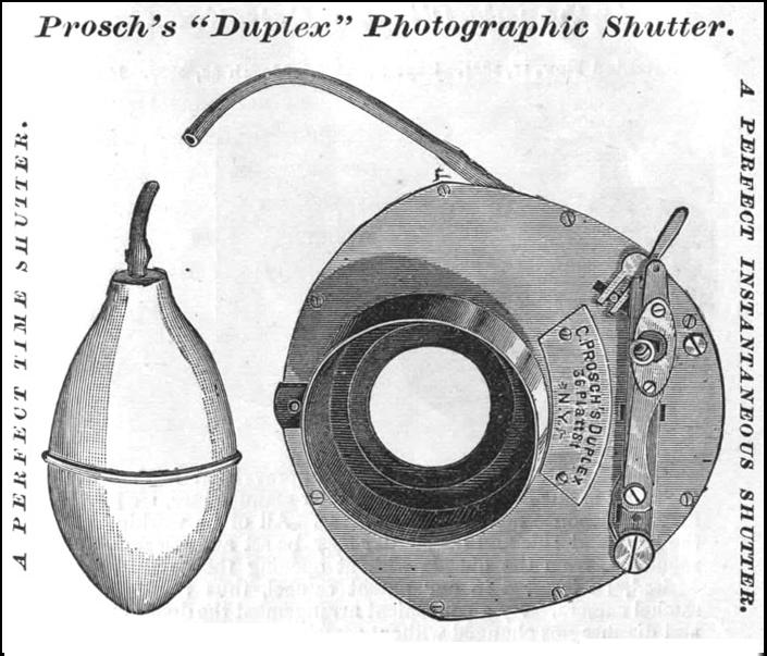The Duplex would continue to be sold through the end of the century, but that didn't stop Prosch from bringing more shutter models to the marketplace. In 1888, he brought the Prosch Rapid shutter to market. This model featured speeds from 1/100 to 1/1600 or so claimed an article in Wilson's Photographic magazine in its May 16, 1891 issue. It was a bit of a specialty shutter as it only featured instantaneous speeds and was recommended for use at race tracks and athletic competitions.