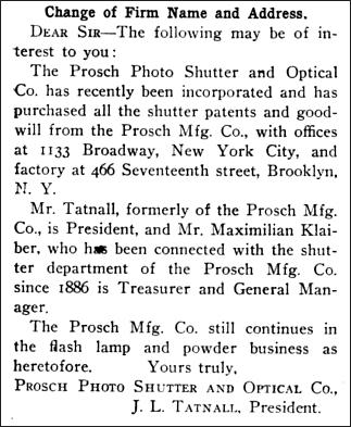 In July of 1906, an article was published in Camera Craft magazine announcing the sale of the Prosch company to two employees of the original company. Cyrus N. Prosch would spend the rest of his life living in Fort Lee, NJ, his birthplace, until his passing in 1920. The Prosch company went on to focus on flash powder lamps (which it added to its product line in the 1890's) and eventually battery driven and electrified flash products. The last advertisement I am able to find for the company was from 1921.