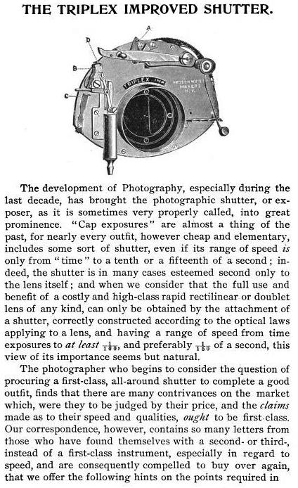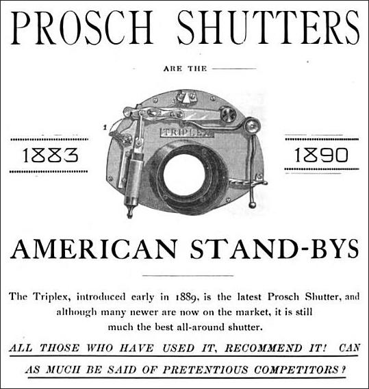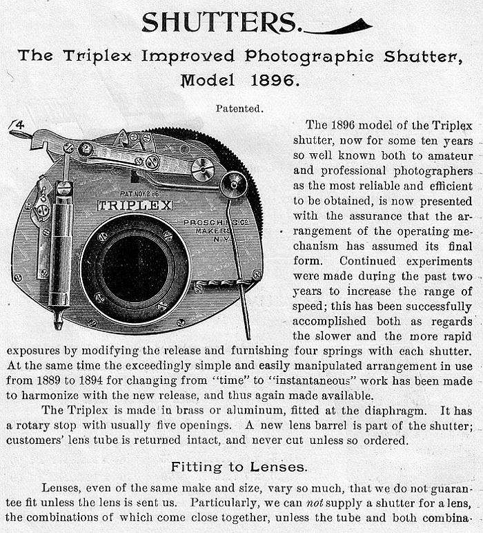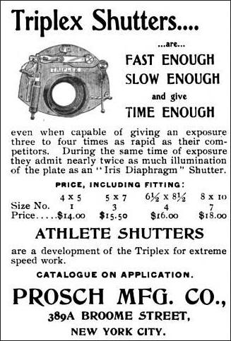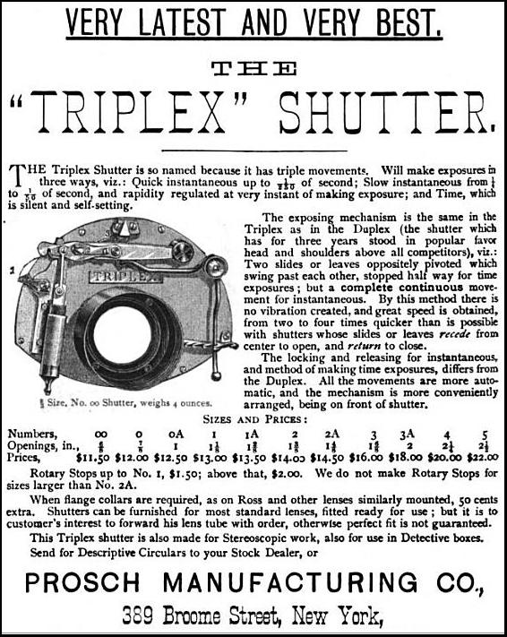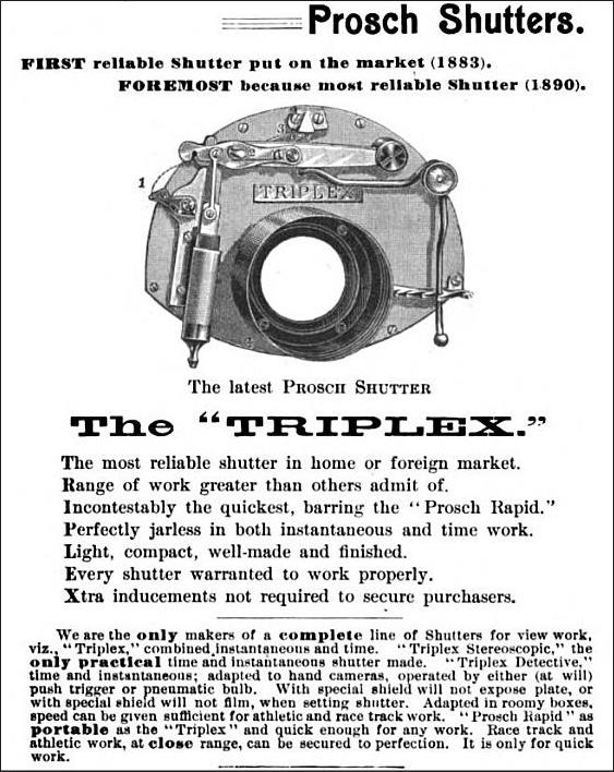 In early 1889, Prosch brought out his Triplex shutter, a further improvement on the Duplex. Whereas the Duplex was known for its two main functions of instantaneous speeds and timed settings, the Triplex was so named for its three functions: quick instantaneous speeds up to 1/250; slow instantaneous speeds from 1/50 to 1/4 and the ability to take timed exposures.