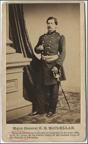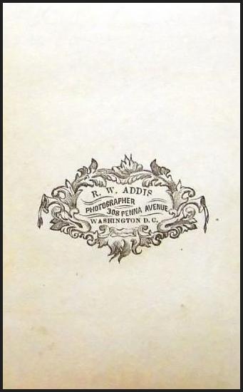To continue, Addis appears to have assumed ownership of the gallery in 1862, perhaps 1863. Not only is the supported by a CDV that now only lists Addis in the copyright imprint (see below), but also other dated 1862 CDV's that now show a backstamp listing Addis, but no longer McClees. By 1864 (the date being supported by tax stanp use), the backstamp lists the gallery located at 308 Pennsylvania Ave to be the Addis Gallery.