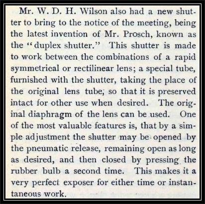 A "Prosch" shutter was sold a few years ago that I am unable to identify. It appears to be simple, Duplex-like and probably dates before 1888. If you can identify this model, I'd like to hear from you. This is the only image available of this item.