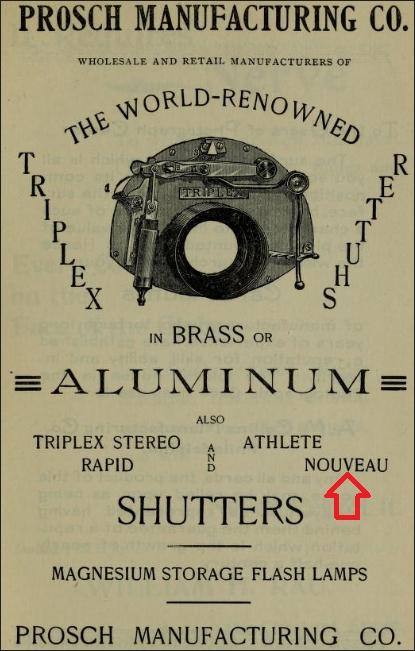 In an issue of The American Annual of Photography for 1894, published in late 1883, Prosch advertised a "Nouveau" shutter. Other than this brief mention, I find no other references for this shutter.