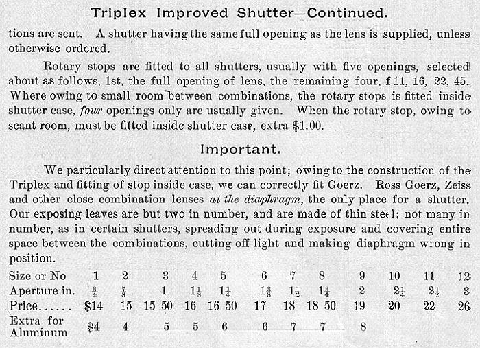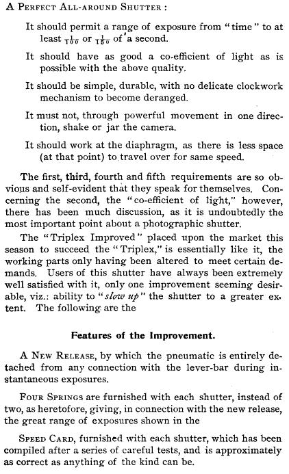 Curiously, in one of Scovill's late catalogues, I found the reference below to a Model 1896 Improved Triplex shutter. It's not entirely clear to me if this differs from the improvements that were made in 1894 - especially since the line drawing differs a bit (although those can be unreliable sources).