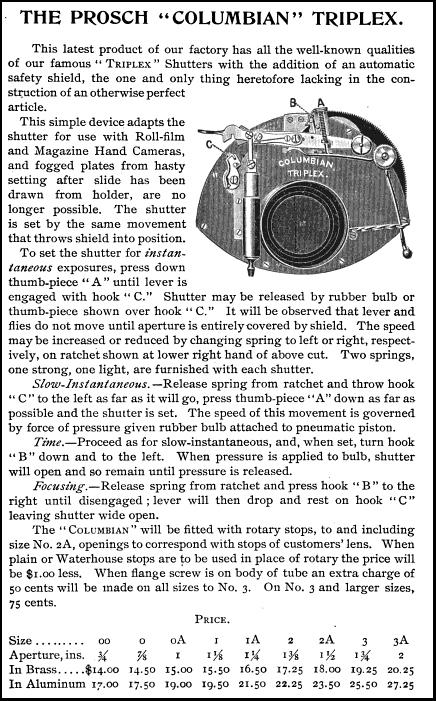 And, if that wasn't enough, in 1894 Prosch made a Columbian Triplex shutter that was made for Hand and Roll film cameras.