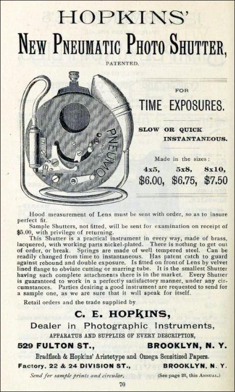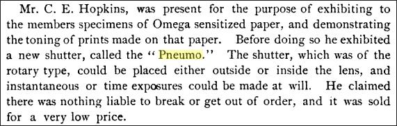 Louis Prosch Jr (b. 1858), whose father immigrated from Germany in 1850, obviously related to Cyrus Prosch, worked for many years as a brassworker for the company. On March 10, 1891, Louis was awarded patent # 447,902 (patent filed for in Aug. 1890), for a front mounted, rotary shutter. For unknown reasons, this shutter would be sold by C.E. Hopkins as the "Pneumo Shutter."