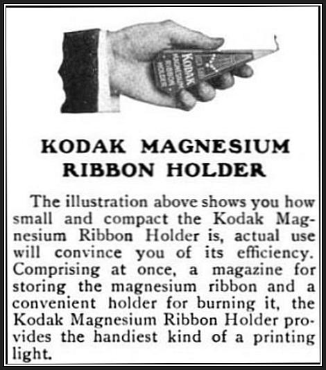 With the price of magnesium low enough and with the great demand created by amateurs wishing to use portable artificial lighting, manufacturers developed a significant number of apparatus utilizing flash powder and magnesium ribbon from the 1890's through the 1920's. As time passed, magnesium ribbon was used far less for taking images, but its bright, steady output of light was used for print making and enlarging in the darkroom.