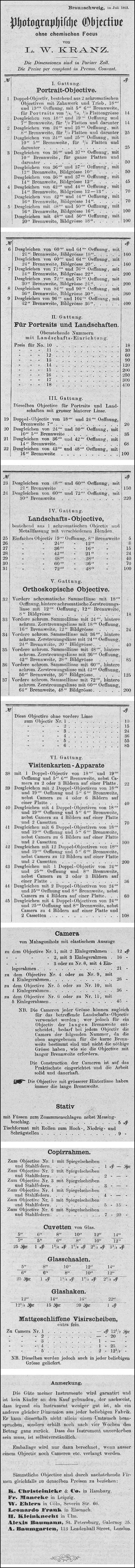 LW Kranz, a former Voigtlander employee, went out on his own and produced lenses beginning about 1860. Also located in Braunschweig, Kranz went head to head with Voigtlander by producing Petzval, Orthoscope (Orthoskop) and landscape lenses. Presented below are catalgoue pages from July 1861.