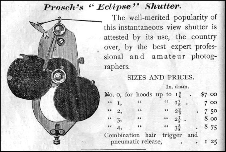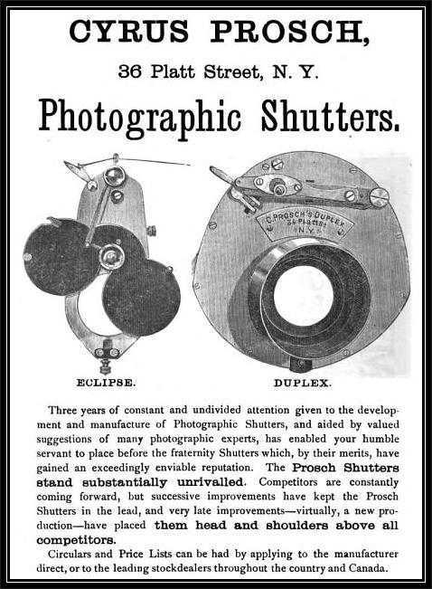 Cyrus N. Prosch (1849-1920), would indeed follow in his father's footsteps as an instrument maker. In 1882, he patented a telegraph key, and then in late 1883 built a working version of his first model shutter which he filed a patent for in January 1884. The shutter was originally known as the "Prosch Instantaneous Shutter" but eventually called, the Eclipse. The February 1884 issue of Anthony's Photographic Bulletin ("APB"), first mentions the existence of this item.
