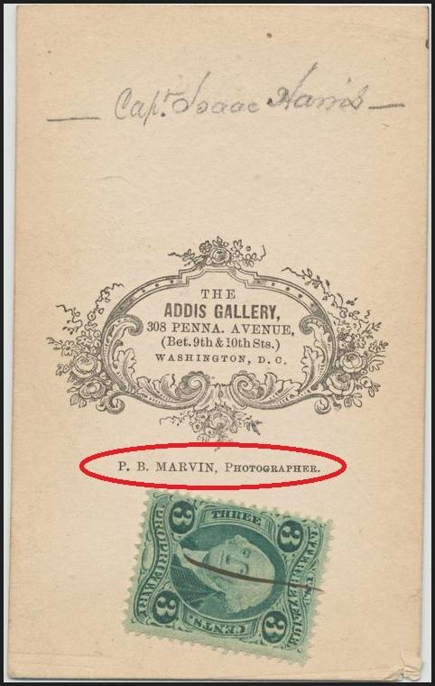 But wait, where does Marvin come in ? Well, the CDV's that feature the imprint of the Addis Gallery (c.1864) now list a new photographer for the gallery. Guess who ? P.B. Marvin !