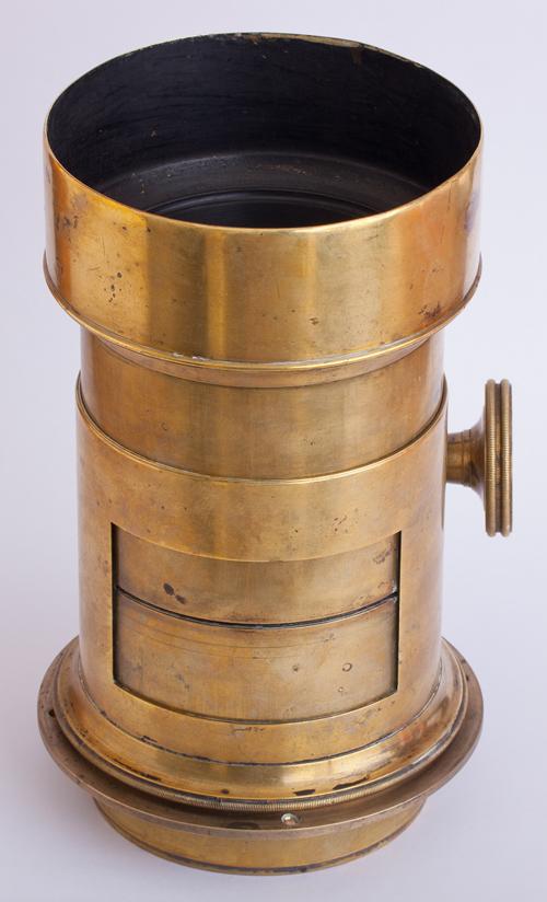 This half plate sized lens features a tangential drive for its rack-in-pinion focusing (knob missing), which is typical of European manufacture and was also the primary construction found on portrait lenses in the US prior to about 1850 when radial drive lenses began to appear.
