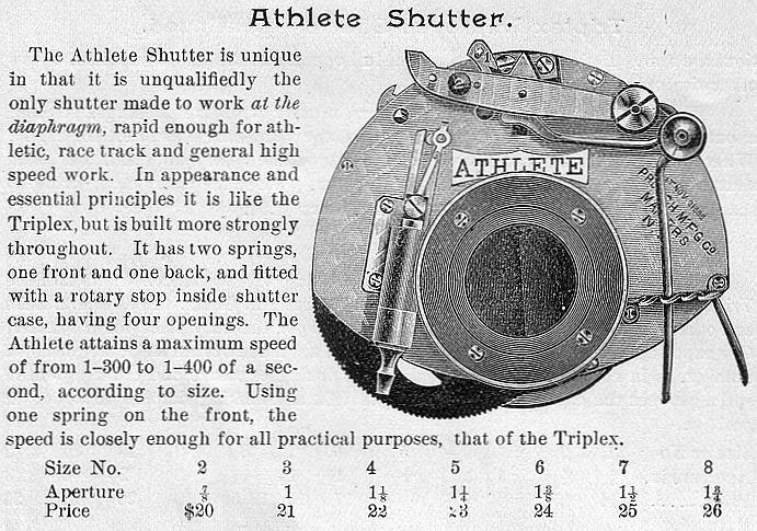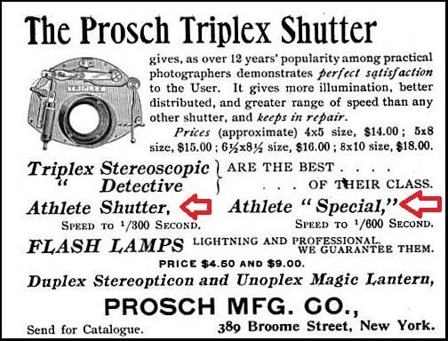 In 1892, Prosch brought out his Athlete shutter which featured speeds to 1/300 or 1/400 second depending on the size. Prosch later added an Athlete Special model which produced speeds up to 1/600 second. An example and line drawing are shown below.