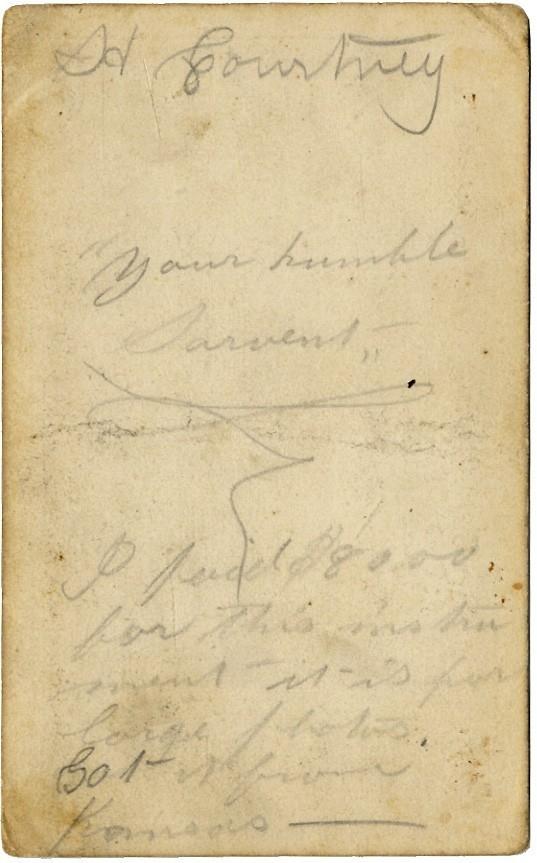 A second image features a photographer with his wet plate camera. The back of the CDV also features the following writing in pencil, "H. Courtney Your humble servant I paid $80.00 for this instrument - it is for large photos Got it from Kansas."