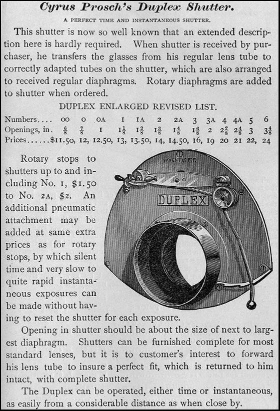 By late 1884 / early 1885, Prosch had brought another model shutter to market, the so called Duplex. While the Eclipse was fixed to the front of an existing lens, the Duplex shutter would sit between lens groups of a chosen lens, typically a rapid rectilinear or symmetrical lens. The "duplex" feature of this shutter was that it could be used to take instantaneous or timed exposures. The supplied lens' own apertures were used when fitted to this shutter.