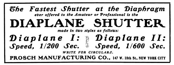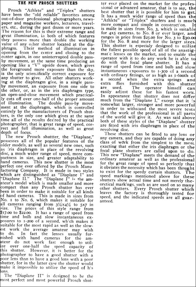 It took until 1903 for Prosch to bring out his final shutter models, the Diaplane I and II. The article below published in 1903 thoroughly describes these new shutters. The patent for this model was not filed until 1905 and was issued in 1906.